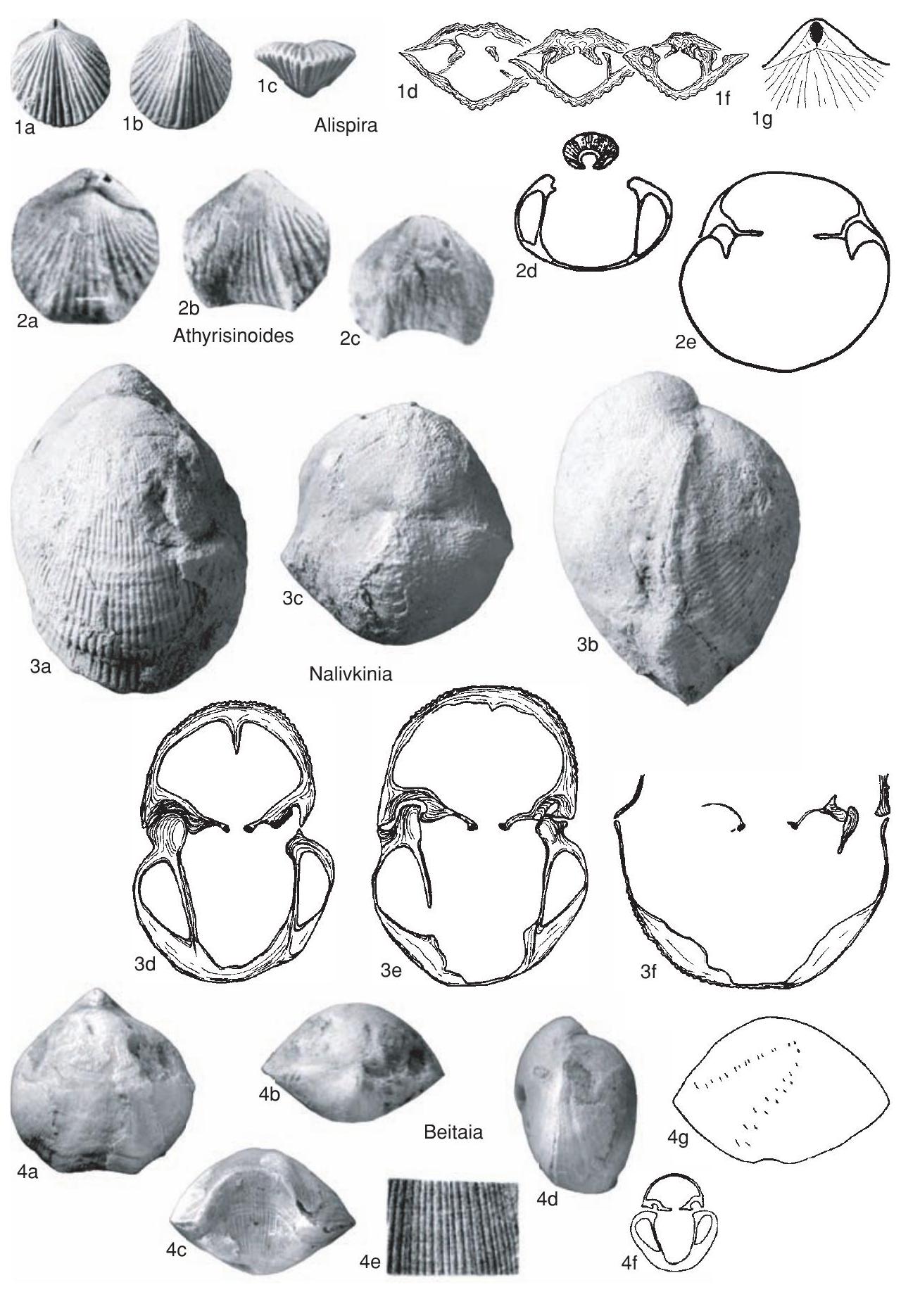 Fig. 965, 4a-g. $* B$. modica, middle Llandovery, Guizhou, $a-d$, dorsal, posterior, anterior, lateral views, x2$, enlargement of fine ribs, x4$ (Rong, Xu, & Yang, 1974), f-g, serial sections, x2.5$ (Rong & Yang, 1981).