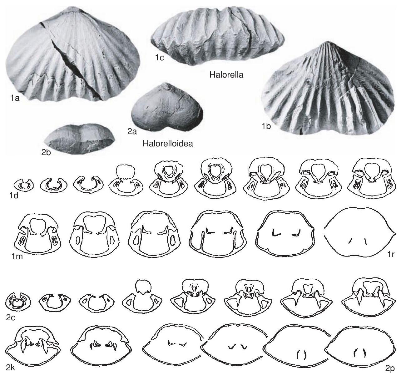 Fig. 847, 1 a-r .*H. amphitoma (Bronn), Norian, Pamirs, a-c, dorsal, ventral, anterior views, IGiG 200/6, x1, d-r, transverse serial sections, distances in mm from first section, 0.0, 0.3, 0.6, 1.2, 1.8, 2.4, 2.7, 3.1, 3.3, 3.6, 4.1, 4.6, 5.3, 5.9, 6.7 (Dagys, 1963).