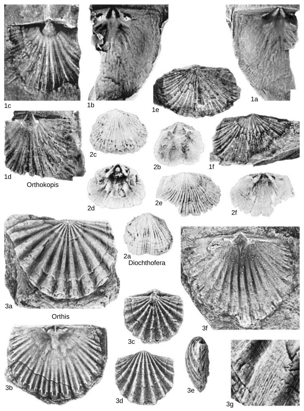Fig. 523, 3a-g. *O. callactis Dalman, Arenig-Llanvirn, Sweden, $a$, dorsal exterior, x2.5, b$, dorsal interior, x2, c-e$, dorsal, ventral, lateral views of conjoined valves, $X_{2}$, $f$, ventral interior, x1}, g$, details of capillate ornament, $\\times_{10}$ (Jaanusson & Bassett, 1993).