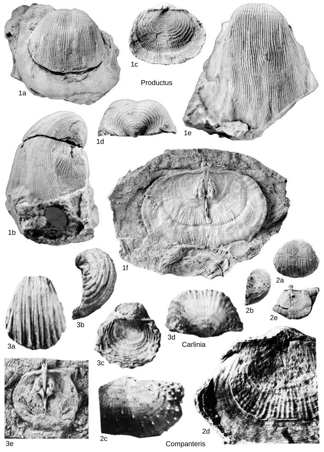 Fig. 313,1a–e. *P. productus (MARTIN), upper Viséan, Derbyshire; a–d, complete holotype, ventral, lateral views, BMNH B 40952, dorsal, posterior views of detached corpus region, ×1; e, anterior view of ventral valve, × 1 (new).——Fig . 313,1f. P. carbonarius ( DE K ONINCK ), lower Serpukhovian, Yorkshire; latex replica of dorsal valve interior, ×2 (Muir-Wood & Cooper, 1960).