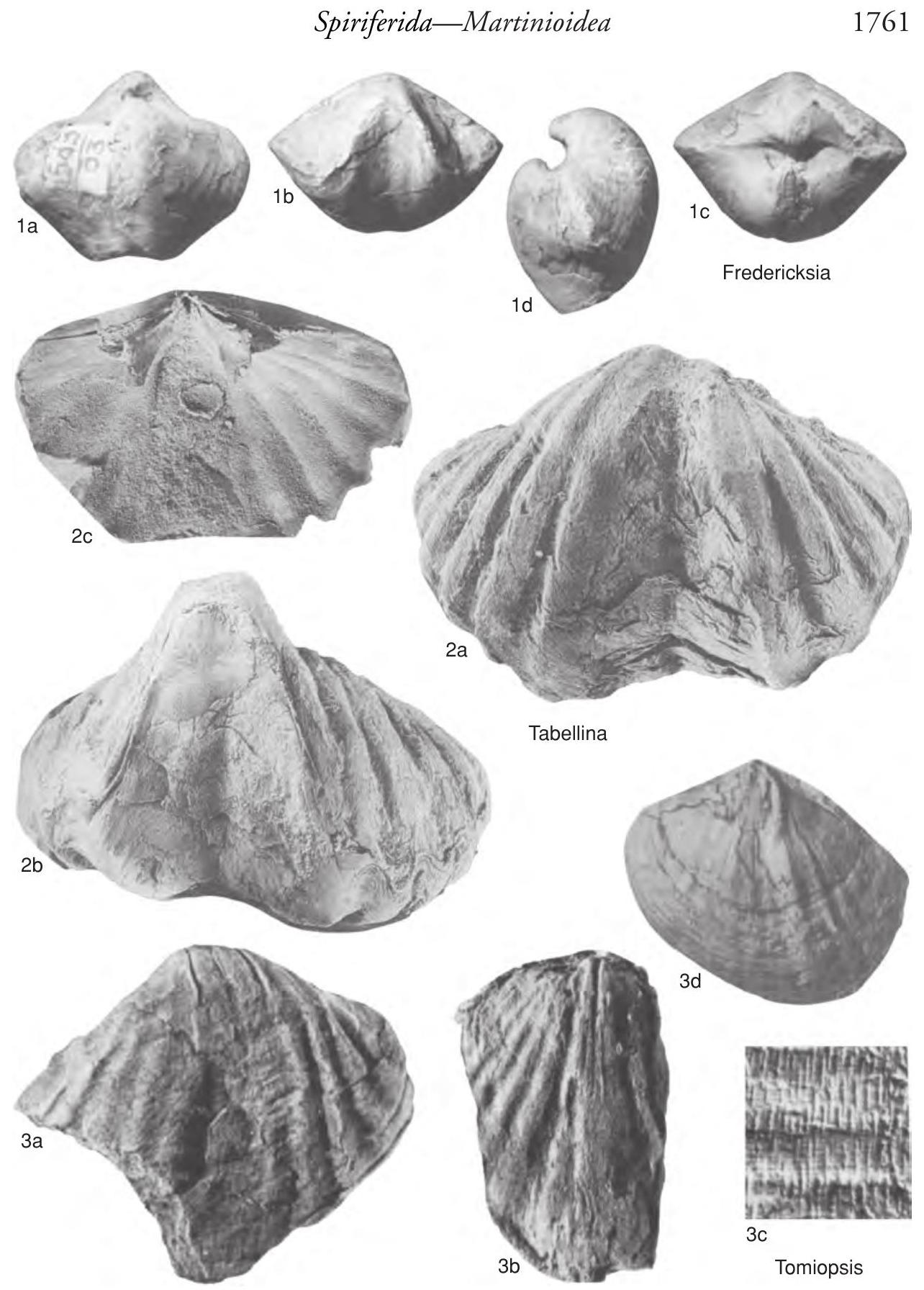 Fig. 1158, 3a-c. * T. kumpani (Yanishevsky), upper Visean or Namurian, Kuznets basin, a-b, spalled ventral exterior and dorsal internal mold showing median septum, X1, c, microornament of external mold, X10"